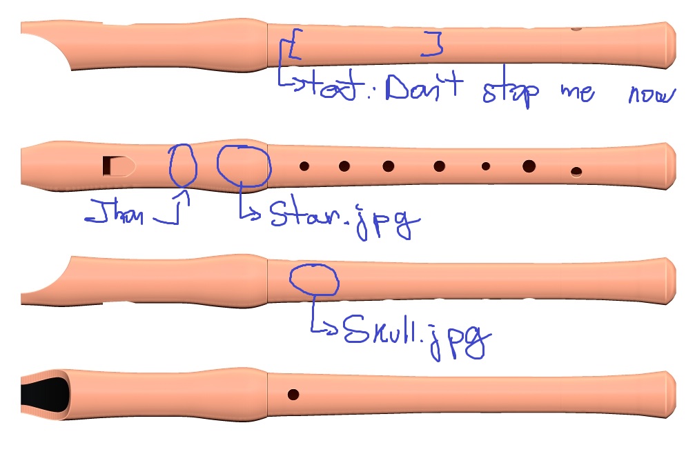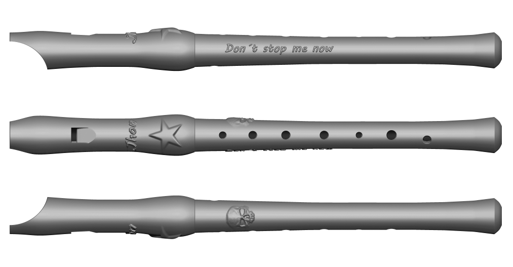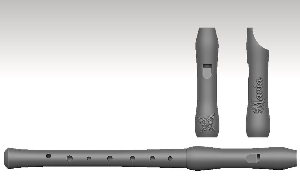 You have available all the recorder surface to decorate it, we can include the name or inscription provided by you, besides, choose a simple image or a pattern to decorate the recorder middle section, head or foot, and we will sculpted it, where you want. We send to you a file with the final result before the recorder print. Of course, you can choose the color of the head, middle section and foot. You can specify all the details, and upload the images in our oder form when you summit the order.